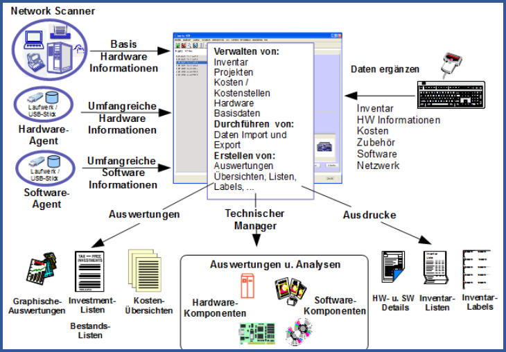 Inventarinformationen über Hardware, Software, Zubehör und Kosten liegen in einem System